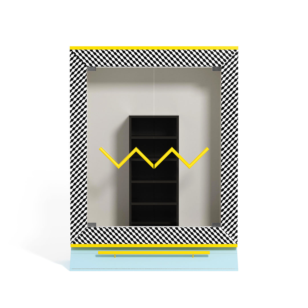 ミケーレ・デ・ルッキによるパシフィックは謎めいた作品です:収納キャビネット、それとも建築作品でしょうか?おそらく両方でしょう。メンフィス特有の無秩序で不遜な性格を持ち、デ・ルッキはパシフィックの真の機能を同時に主張し否定し、最終的な判断を観察者に委ねるかのようです。装飾ラミネートで覆われた木製ワードローブ、強化ガラスの扉、金属の要素。